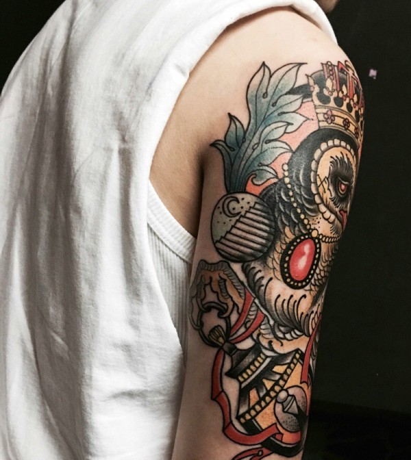 经典花臂复古猫头鹰纹身刺青