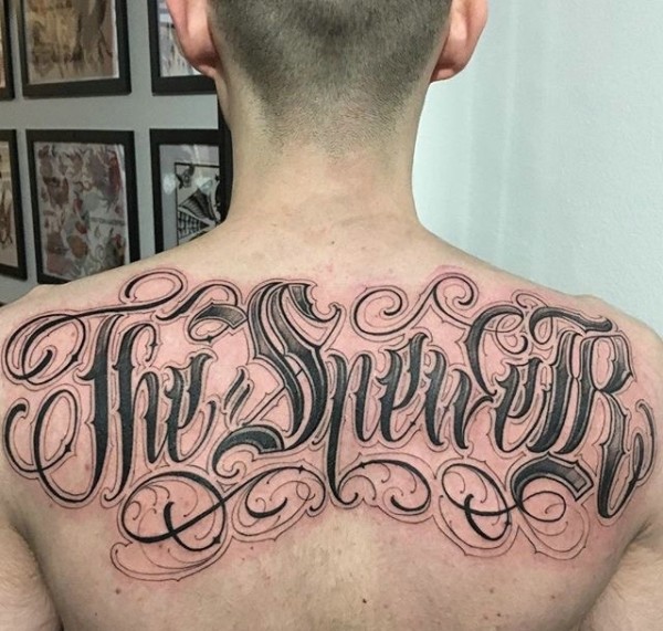 后背大花体英文纹身图片相当抢眼