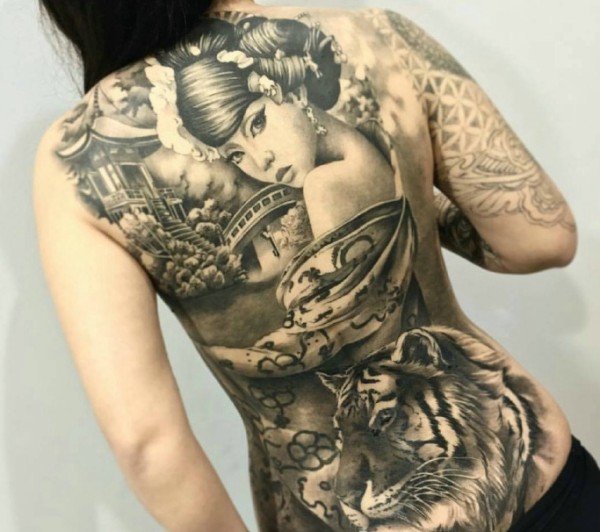 性感女生满背创意文身作品