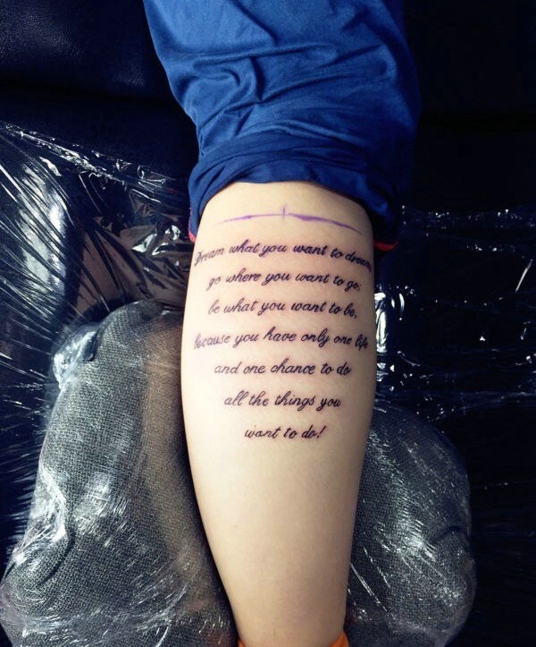 腿部密密麻麻的个性英文纹身图案