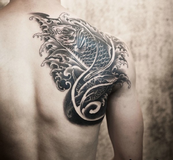 遮盖后背一小部分的黑白鲤鱼纹身图案