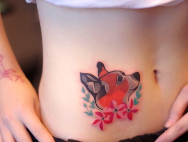 遮盖疤痕的腹部水彩小狗纹身刺青