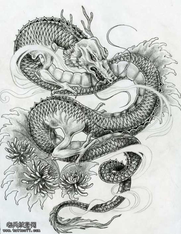 龙纹身手稿_一组老传统黑灰龙手稿纹身图案
