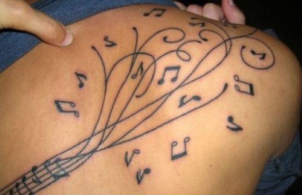 背上飞扬的五线谱音乐符号纹身