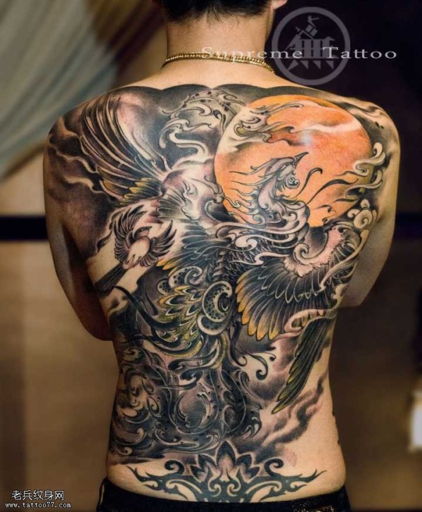 满背黑灰凤凰纹身图案