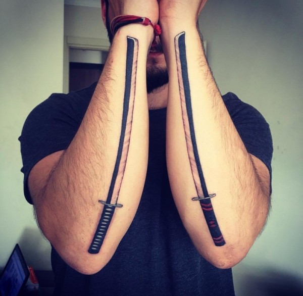 男子双手前臂上的武士刀纹身图案