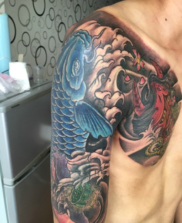 鲤鱼与般若结合的半甲纹身图案