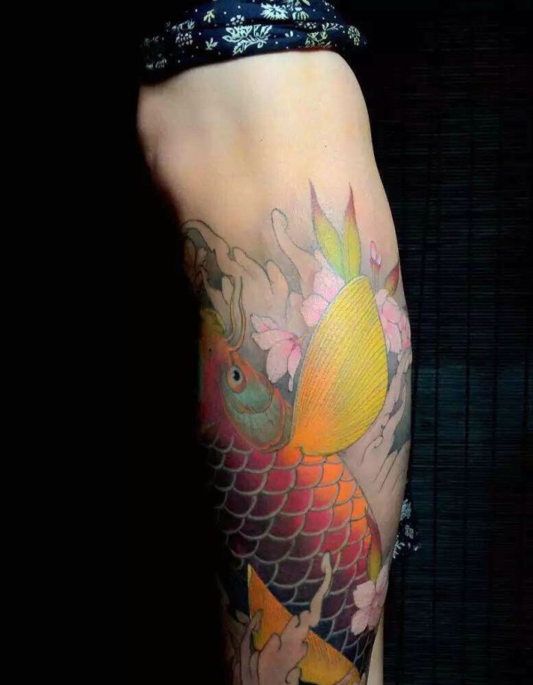 活泼亮丽的腿部彩色鲤鱼纹身图案