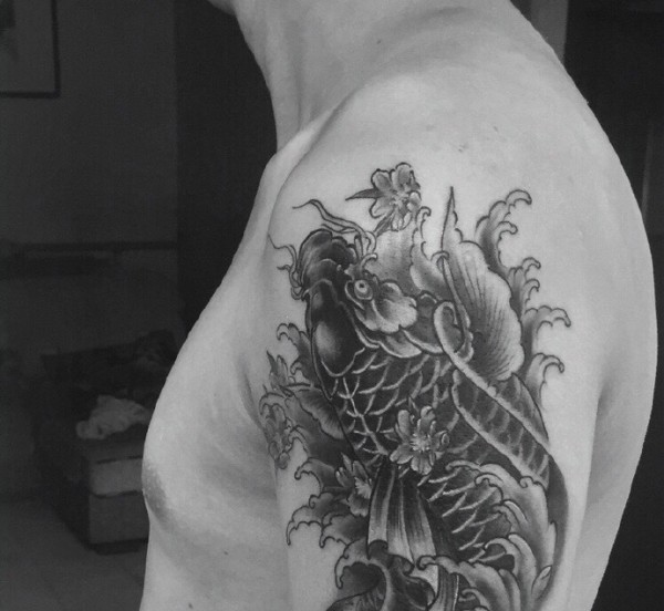 大臂老传统黑白鲤鱼纹身图案