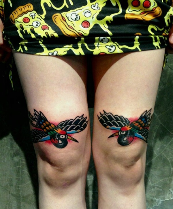 双膝盖上的彩色两只小燕子纹身图案