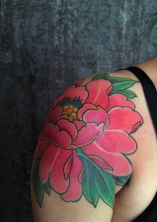 大臂鲜艳的牡丹花纹身图案