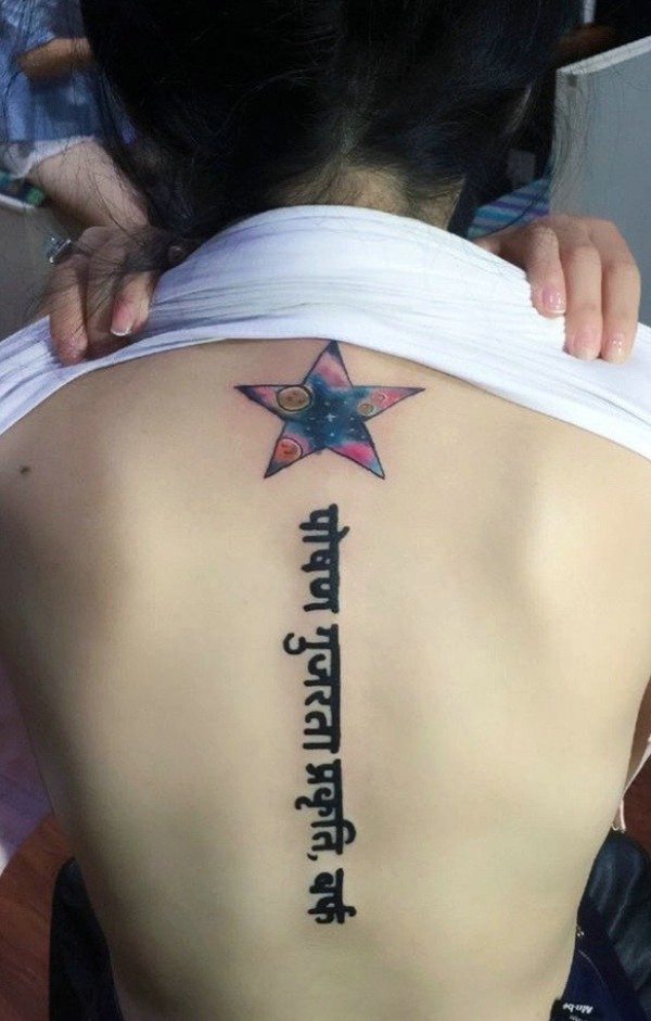 脊椎部彩色五角星与梵文的纹身图案