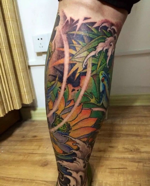包小腿彩色莲花与鲤鱼的纹身图案