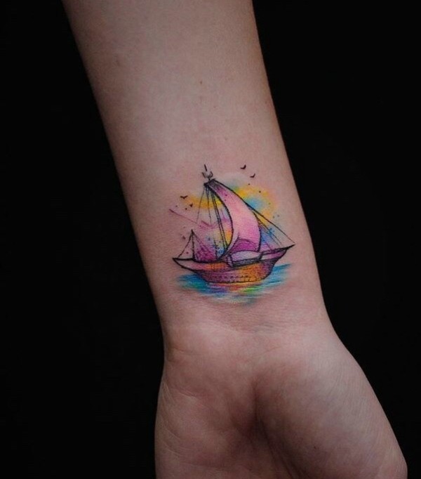 一款迷你水彩帆船纹身图案
