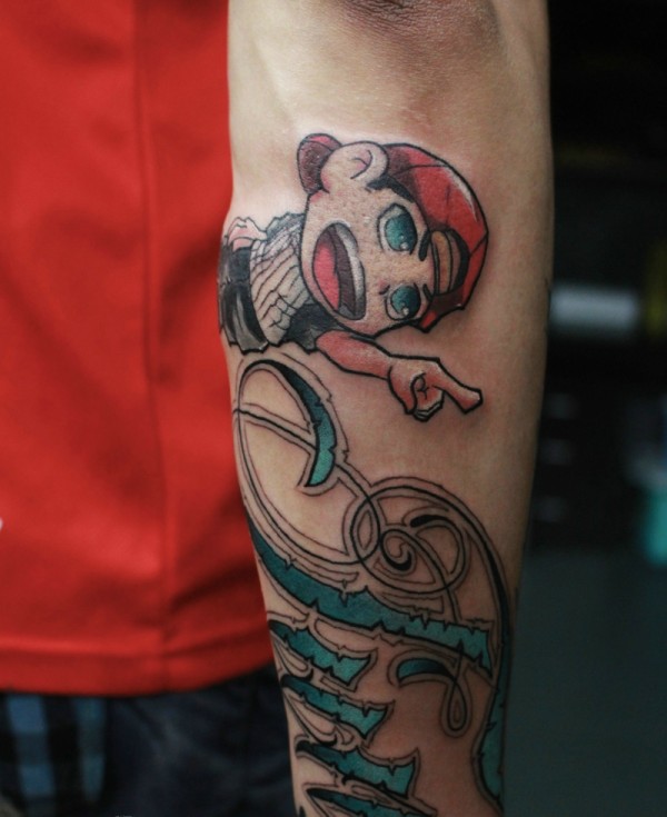 卡通小孩与花体英文的手臂纹身图案