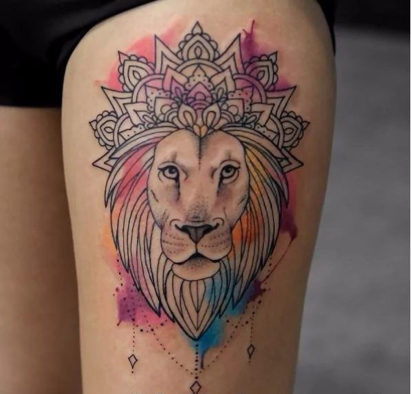 女子大腿部漂亮的水彩线条狮子纹身图片