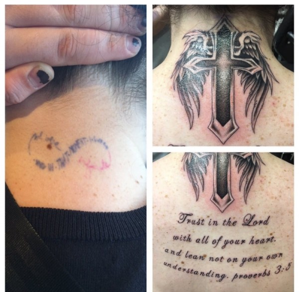 女孩后颈部帅气的多英文字和翅膀十字架覆盖纹身图片