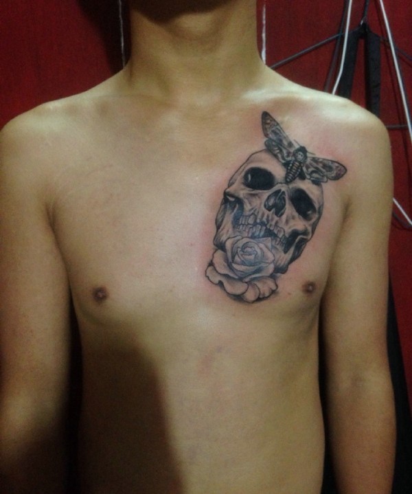 黑灰色玫瑰花和骷髅头纹身图片手稿