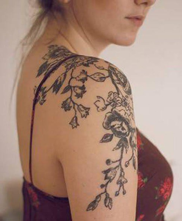 女生肩花纹身_15张女性双肩对称的肩花纹身图案作品图片