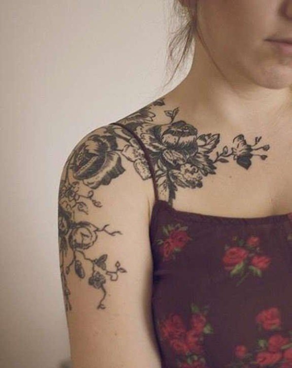 女生肩花纹身_15张女性双肩对称的肩花纹身图案作品图片