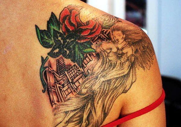 女生肩花纹身_15张女性双肩对称的肩花纹身图案作品图片