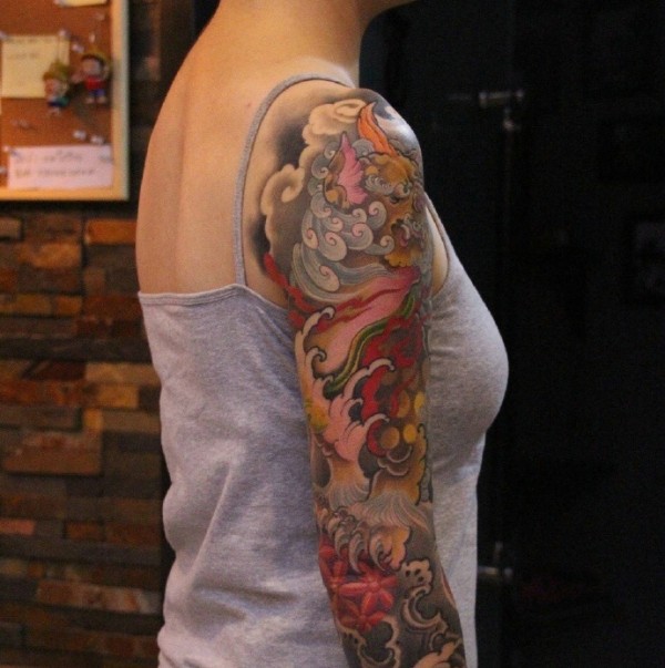 颜色丰富的花臂纹身图案很抢眼