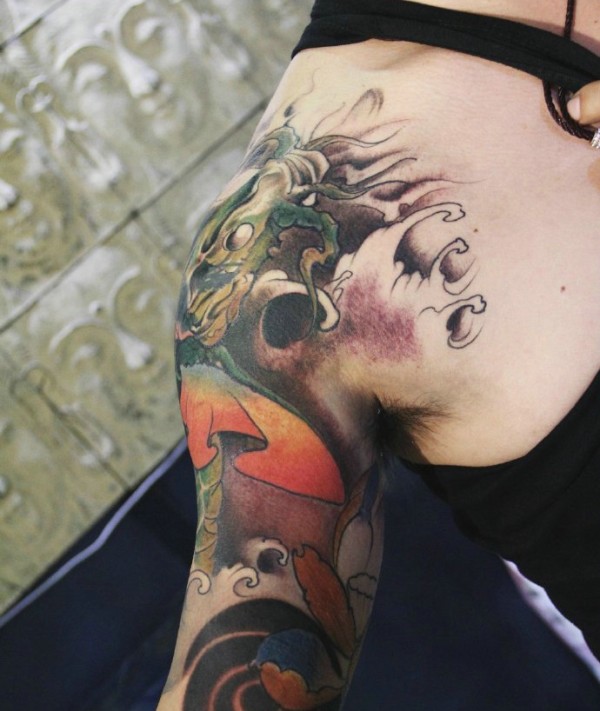 日式手彫刺青作品—半甲龙很感谢客户认可手彫刺青,手彫是日本纹身的手工雕刻技术,时间可以追溯到日本17世纪的江户时代。19世纪,手彫技术被日本黑帮挪用,被用作入会仪式,象征着从此就是江湖中人。在日式传统