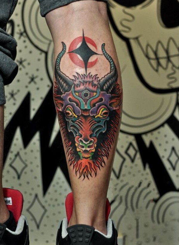 腿部创意羊角头彩绘图腾纹身