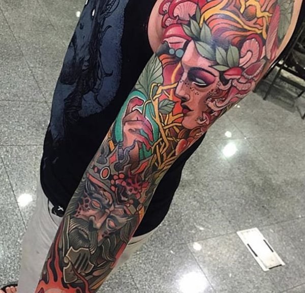 生动的新传统风格花臂纹身图案来自于纹身师约翰尼
