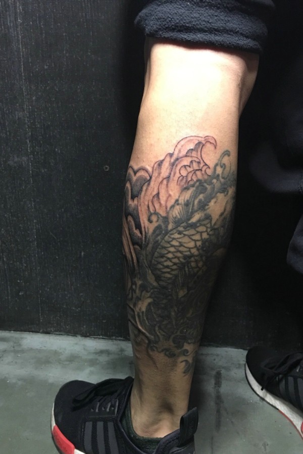 包小腿黑灰鲤鱼浪花纹身图案个性十足