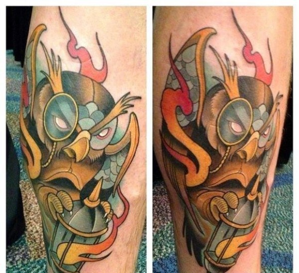 小腿上一款个性的猫头鹰纹身图案