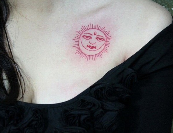 美女胸部红色的太阳图腾个性纹身