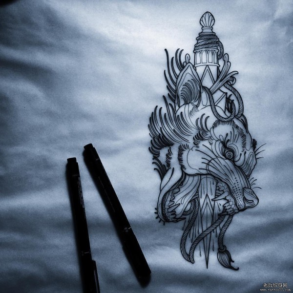 old school狼头匕首纹身图案手稿