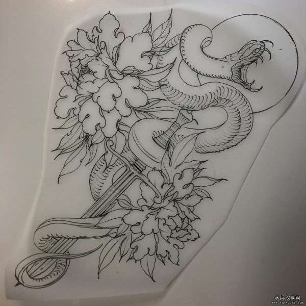 school欧美蛇牡丹花匕首纹身图案线条手稿