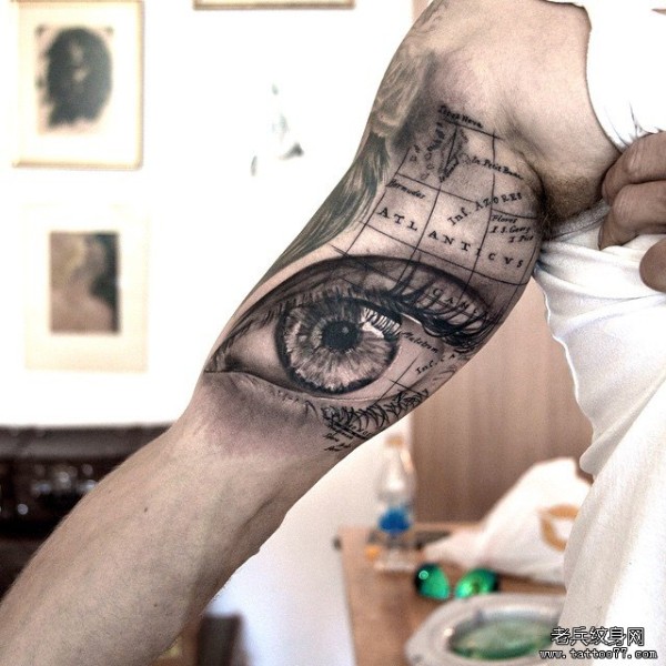 大臂黑灰经纬度欧美写实眼睛纹身图案