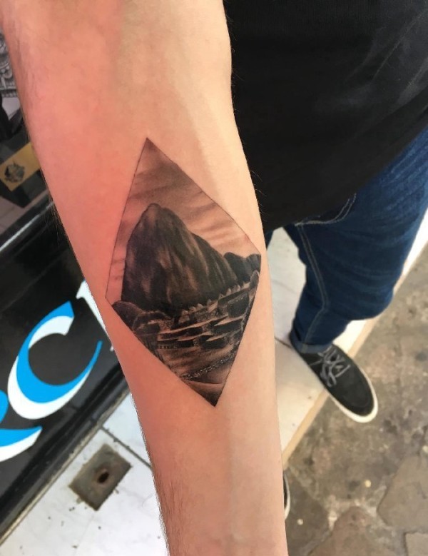黑灰色几何图形风景纹身手臂上山石纹身图片