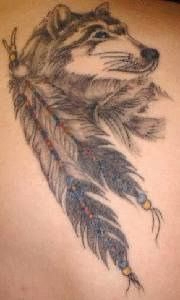 黑白狼头羽毛纹身图案