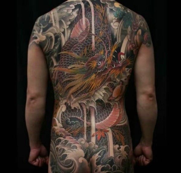 霸气无敌的满背彩色大邪龙海浪纹身图案