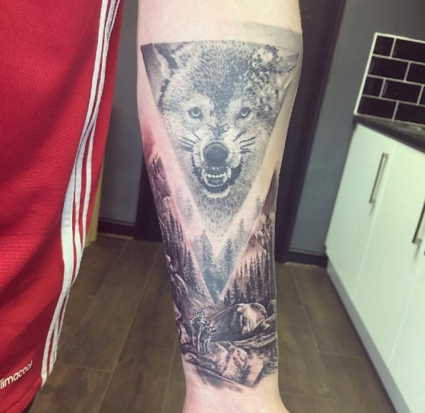 黑灰白色手前臂纹身风景图和倒三角形狼头纹身图片