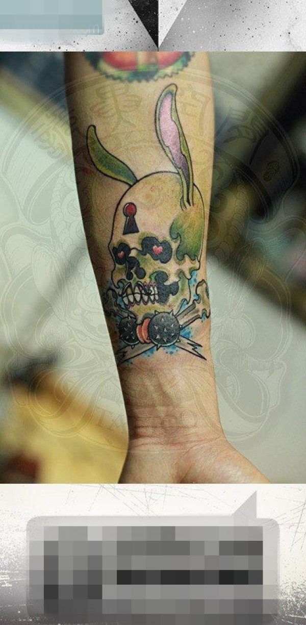 男生手臂另类时尚的兔耳朵的骷髅纹身图案