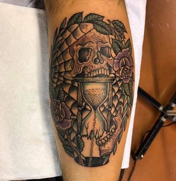 帅气的植物藤缠绕着骷髅头和沙漏纹身图片