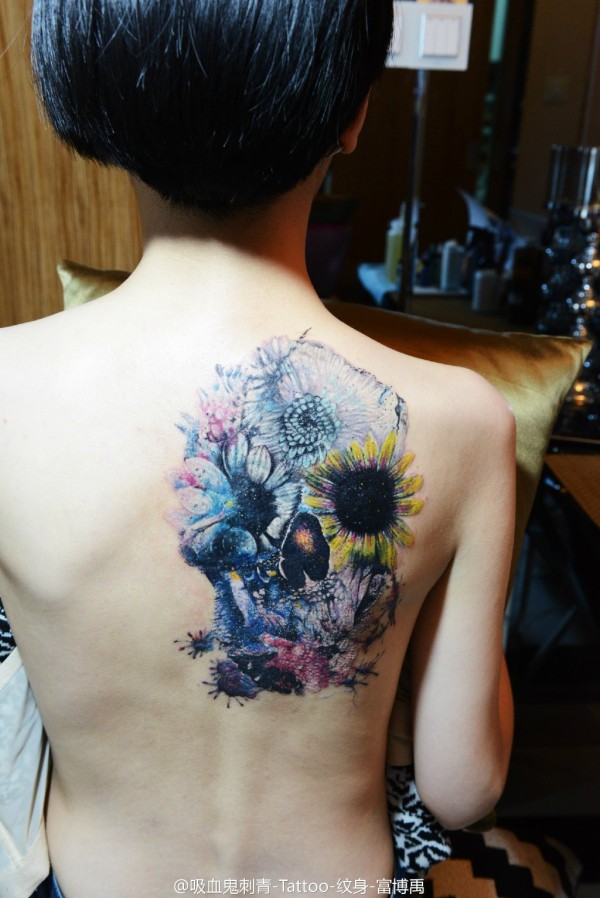 女生后背唯美时尚的小骷髅纹身图案