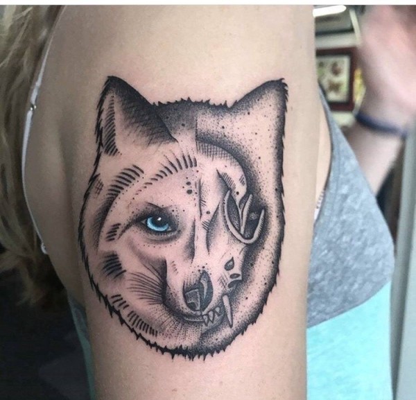 美女右手臂上黑色点刺纹身动物狐狸纹身图片