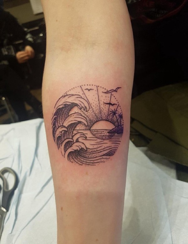 手小臂上精致的几何圆形里的海浪景色纹身