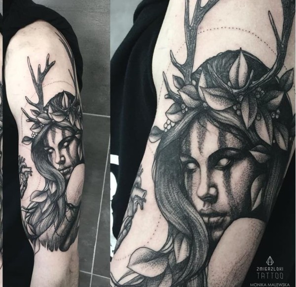 男人大臂黑白彼岸花骷髅_黑白纹身图案大全_纹身图吧