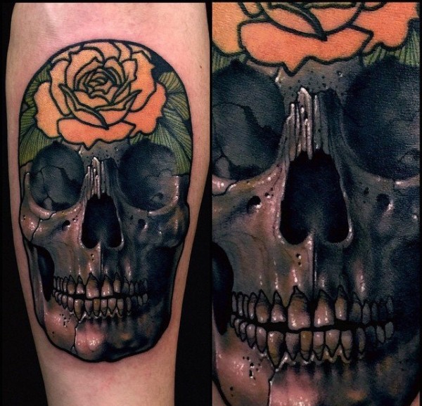 女生手臂经典潮流的骷髅与玫瑰花纹身图案
