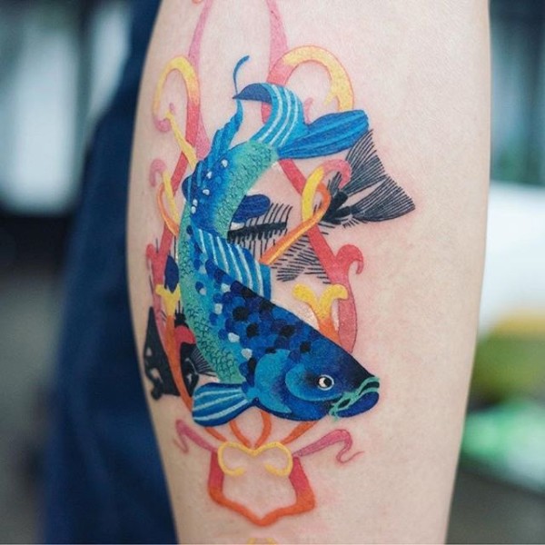 小腿彩色的鲤鱼纹身图案