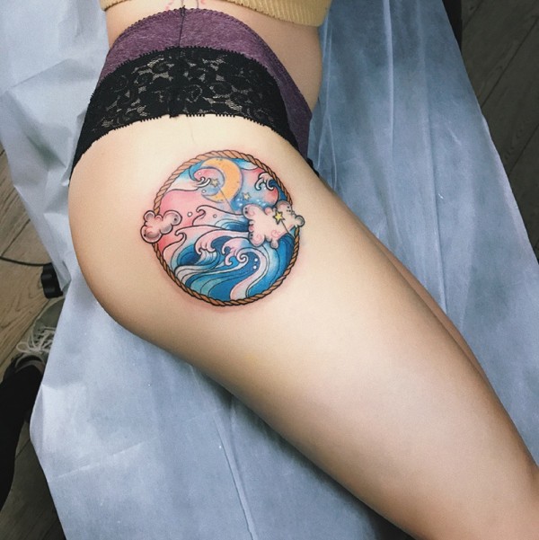 大腿海浪彩绘纹身图案