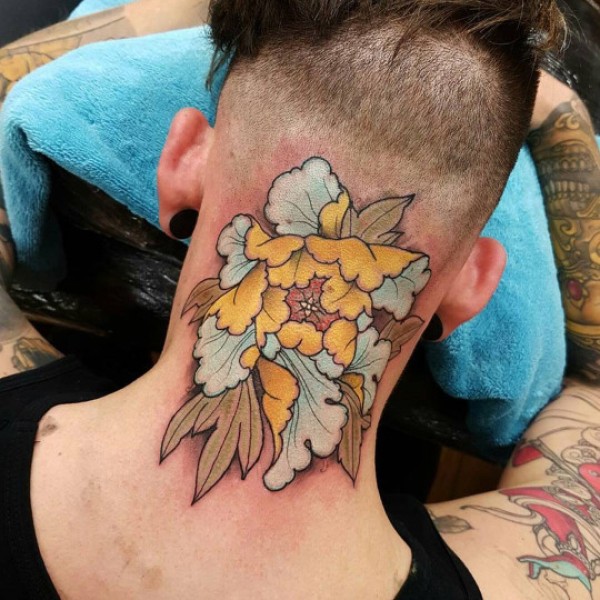 后颈部牡丹花彩绘纹身图案