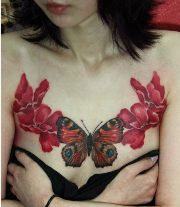 美女胸部盛开的花朵和蝴蝶纹身图案